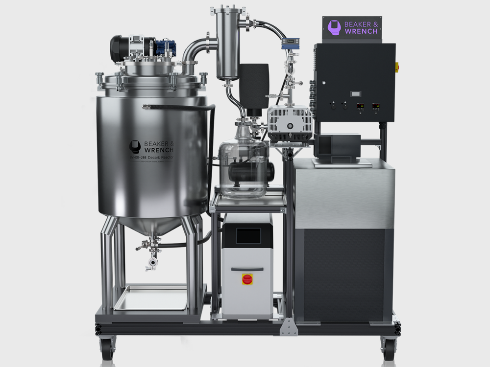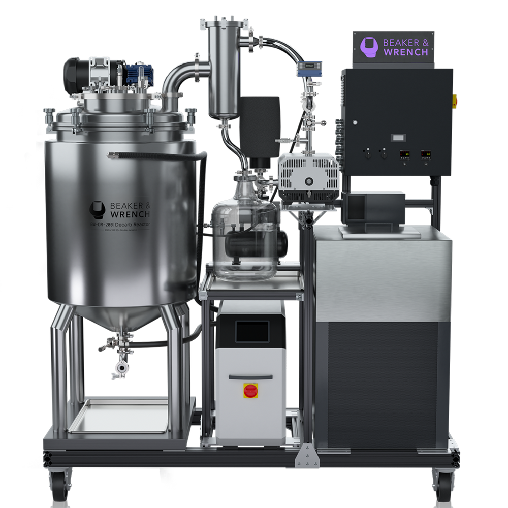 Beaker & Wrench’s BW-200LDR is a heated, mixed, vacuum-controlled stainless steel reactor vessel optimized for decarboxylation of 200L of crude extract in 4-6 hours depending on input material.